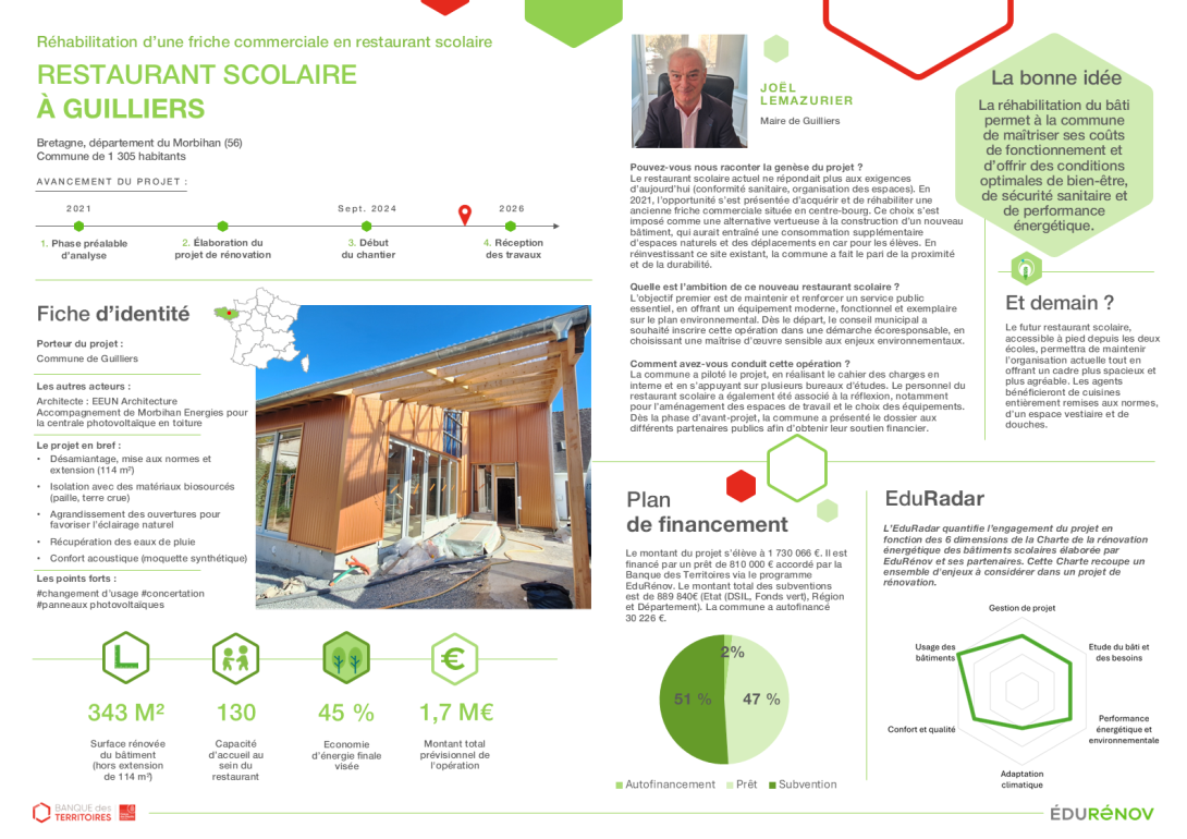 Fiche cas d'école : réhabilitation d'une friche commerciale en restaurant scolaire à Guilliers (56)