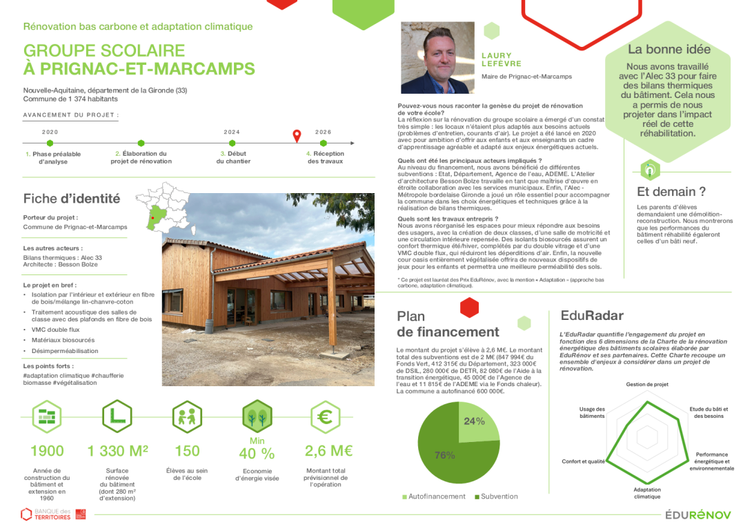 Fiche cas d'école : rénovation bas carbone et adaptation climatique d'une école à Prignac-et-Marcamps (33)