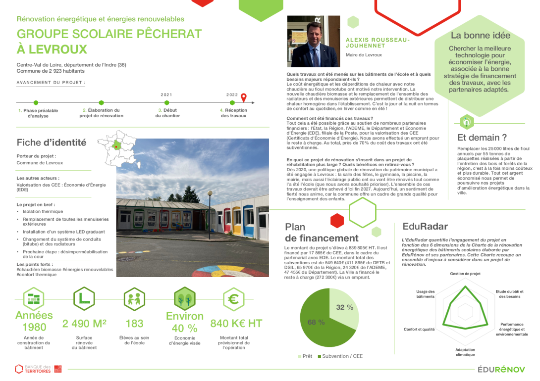 Fiche cas d'école : rénovation énergétique d'un groupe scolaire et énergies renouvelables avec valorisation des CEE à Levroux (36)